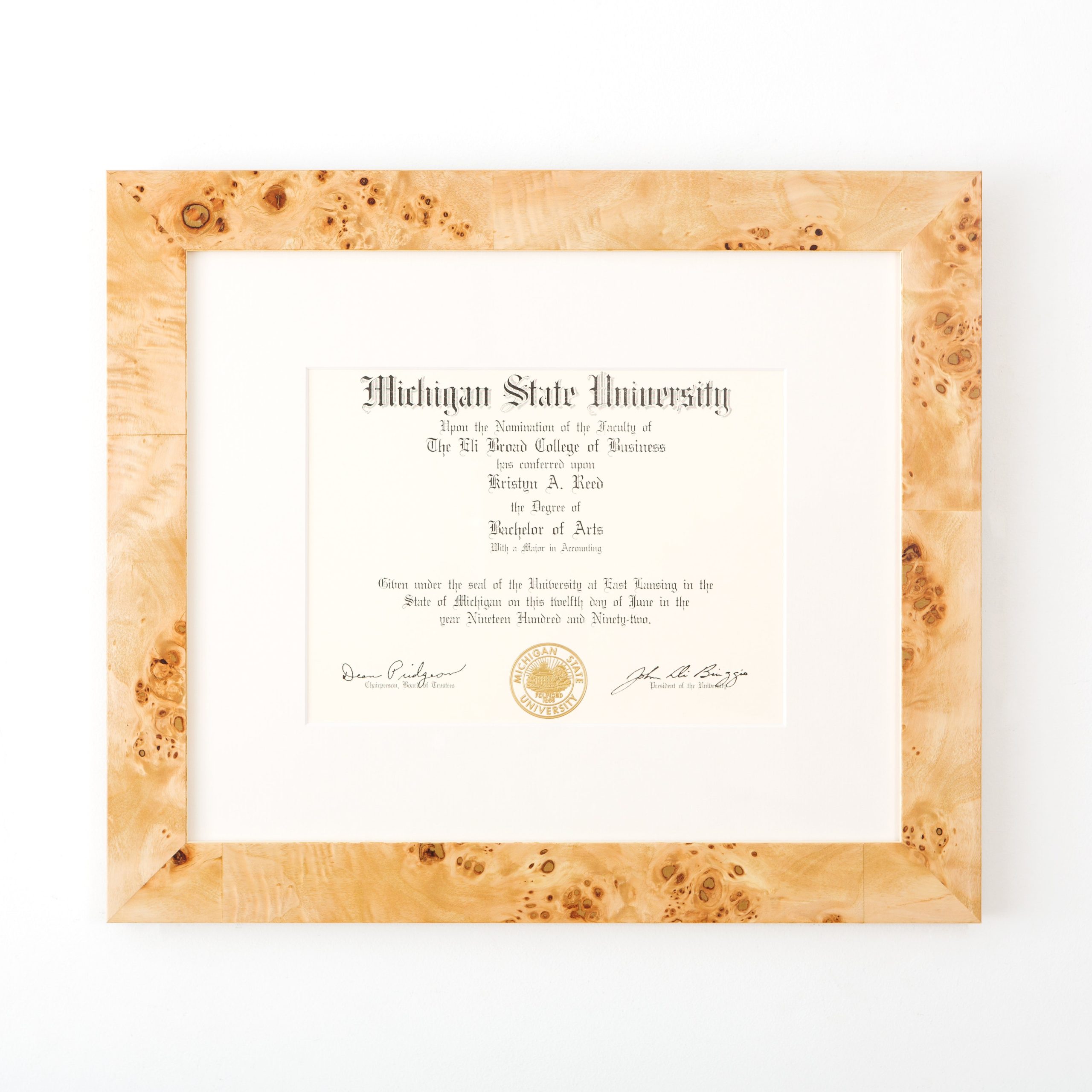 This frame is interesting and sophisticated. There’s a reason burl wood is so on trend right now!