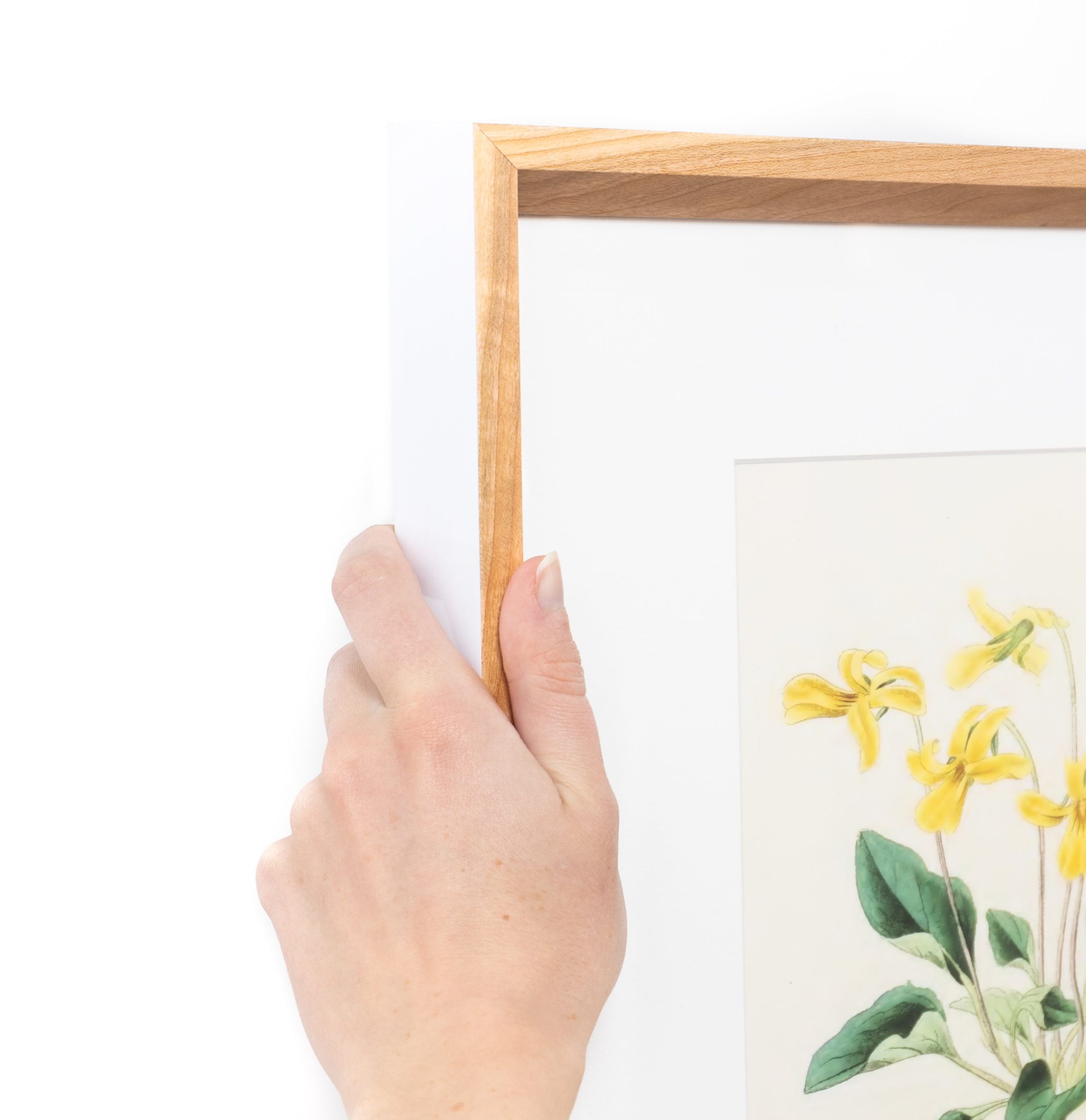 From the front. this appears as a solid cherry frame with an angled profile. drawing the viewer’s eye in. From the side. a lacquered white finish adds an unexpected. lightening touch. This frame works beautifully with original artworks.